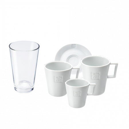 Perfektní kvalita, stylové šálky a sklenice s logem značky kávy dokonale zdůrazní vaši profesionalitu při servírování kávy. Vše je vyrobeno z kvalitního porcelánu a skla, vhodné i pro mytí v myčce.